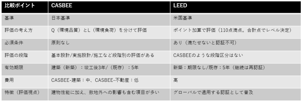 日本の環境認証であるCASBEEとLEEDについて、それぞれの特徴を整理しました。