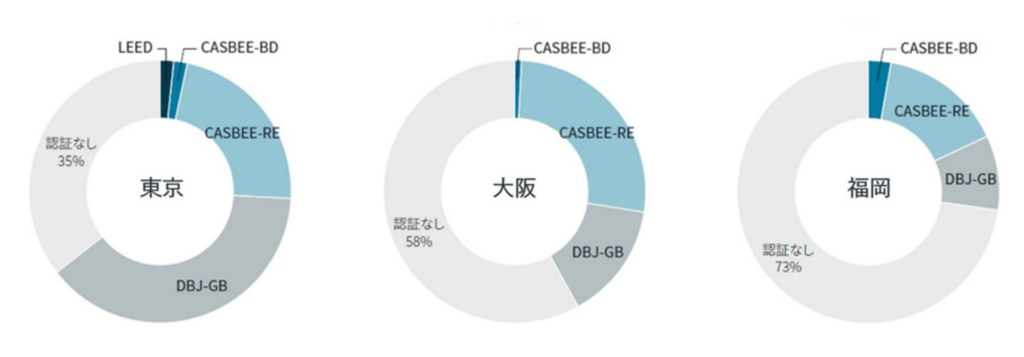 東京・大阪・福岡の大規模オフィスビルでも認証取得が進み、2024年末時点で「何らかの認証」を取得している割合は、**東京65%/大阪42%/福岡27%**です。