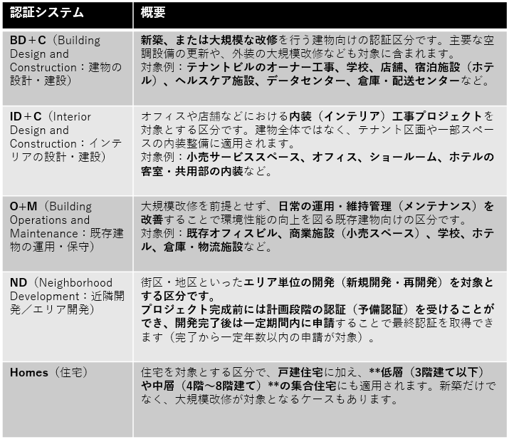 LEED認証は、評価する対象別に以下の5種類に分類されます。